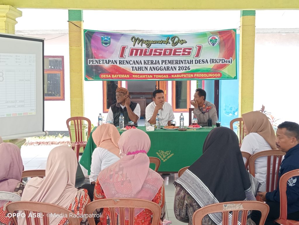 Pemerintah Desa Bayeman, Kecamatan Tongas, Kabupaten Probolinggo menggelar Musyawarah Desa (Musdes) Penetapan Rencana Kerja Pemerintah Desa (RKPDes) Tahun Anggaran 2026, Rabu (24/9/2025). Kegiatan ini menjadi salah satu agenda penting dalam proses perencanaan pembangunan desa yang bertujuan menentukan arah prioritas pembangunan pada tahun mendatang.