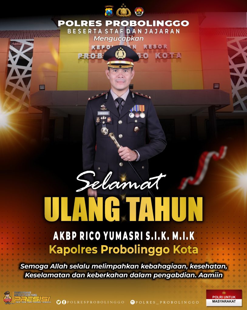 “Selamat Ulang Tahun AKBP Rico Yumasri, S.I.K., M.I.K. Semoga panjang umur, selalu dalam lindungan Allah SWT, dan sukses dalam karier serta pengabdian untuk kemajuan Polres Probolinggo Kota dan masyarakat luas.”