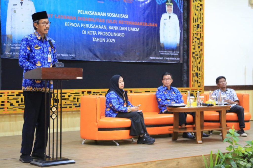 Pemerintah Kota Probolinggo melalui Dinas Perindustrian dan Tenaga Kerja (Disperinaker) terus mengupayakan terciptanya iklim ketenagakerjaan yang lebih inklusif, ramah, dan responsif terhadap kebutuhan penyandang disabilitas. Komitmen ini diwujudkan melalui penyelenggaraan Sosialisasi Unit Layanan Disabilitas (ULD) Ketenagakerjaan yang berlangsung di Hotel Bromo View pada Senin (17/11). Kegiatan tersebut menghadirkan perwakilan dunia usaha, lembaga perbankan, serta pelaku UMKM sebagai bagian dari strategi pemerintah memperluas jangkauan edukasi mengenai ketenagakerjaan inklusif. Sosialisasi ini dibuka oleh Asisten Perekonomian dan Pembangunan Setda Kota Probolinggo, Aries Santoso, yang hadir mewakili Wali Kota Probolinggo, dr. Aminuddin.