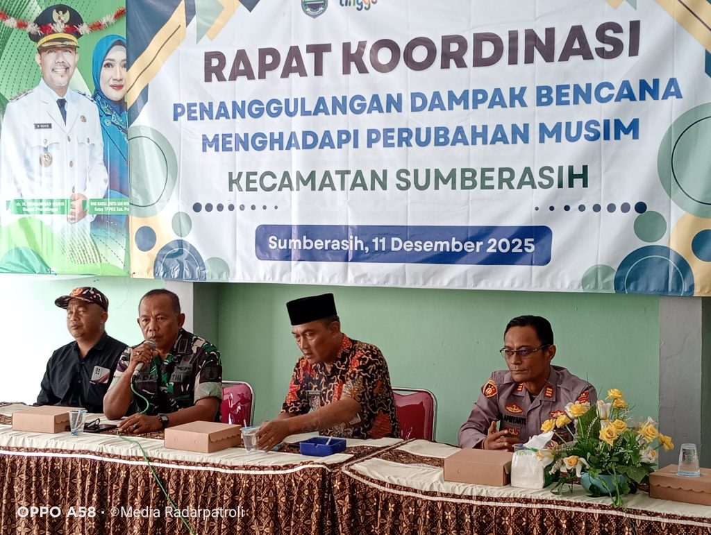 Dalam rangka meningkatkan kesiapsiagaan menghadapi perubahan musim serta meminimalisir potensi bencana dan gangguan keamanan terutama menjelang perayaan Natal 2025 dan Tahun Baru 2026, Kecamatan Sumberasih menggelar Rapat Koordinasi (Rakor) Penanggulangan Dampak Bencana. Kegiatan tersebut berlangsung di Pendopo Kecamatan Sumberasih dan dipimpin langsung oleh Camat Sumberasih, Agus Setijono, S.Sos. Hadir dalam kegiatan ini Danramil 0820-06/Sumberasih Kapt Arh I Made Lugianta, Kapolsek Sumberasih AKP Sugeng Apriyanto, SH, para Kepala Desa, Sekretaris Desa, Bendahara Desa, Ketua Banser Kecamatan Sofyan, serta sejumlah undangan lainnya. Kamis (11/12/2025).
