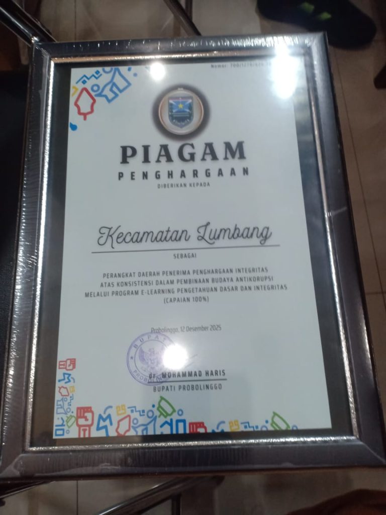 Piagam penghargaan tersebut diberikan kepada Kecamatan Lumbang sebagai perangkat daerah penerima Penghargaan Integritas, berkat keberhasilan melaksanakan Program E-Learning Pengetahuan Dasar dan Integritas dengan capaian 100 persen. Penghargaan ini diserahkan dalam kegiatan resmi yang digelar di Kantor Bupati Probolinggo, Jumat (12/12/2025).