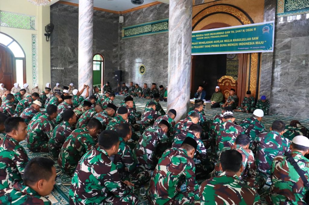 Dalam rangka pembinaan mental dan rohani prajurit, Kodim 0820/Probolinggo menggelar peringatan Isra Mi’raj Nabi Muhammad SAW Tahun 1447 H/2026 M di Masjid Al-Hidayah dengan mengusung tema “meneladani akhlak mulia Rasulullah SAW guna membentuk prajurit yang prima menuju Indonesia maju.”