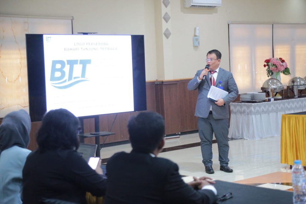 Dalam paparannya, Direktur Perseroda Bahari Tanjung Tembaga Noviyadi menyampaikan rencana bisnis dan arah pengembangan perusahaan untuk tahun 2026. Ia juga memperkenalkan logo Perseroda Bahari Tanjung Tembaga (BTT) yang mengusung konsep tegas, modern, dan profesional. Huruf BTT melambangkan kekuatan dan stabilitas sebagai BUMD, sementara garis lengkung menyerupai gelombang laut merepresentasikan identitas maritim dan kepelabuhanan. Warna biru dipilih sebagai simbol kepercayaan, integritas, serta profesionalisme dalam pelayanan jasa logistik.