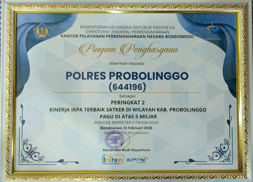 Pada periode Semester II Tahun 2025, Polres Probolinggo berhasil meraih Piagam Penghargaan dari Kantor Pelayanan Perbendaharaan Negara (KPPN) Bondowoso sebagai Peringkat II Kinerja IKPA Terbaik Satuan Kerja di Wilayah Kabupaten Probolinggo.
