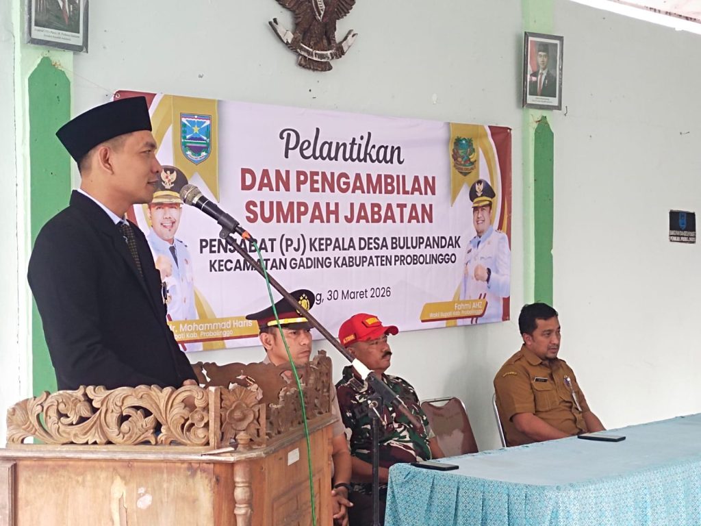 Pelantikan tersebut mengacu pada Keputusan Bupati Probolinggo Nomor 400.10.2/159/426.32/2026 tentang pengangkatan Pj Kepala Desa Bulupandak tertanggal 30 Maret 2026.