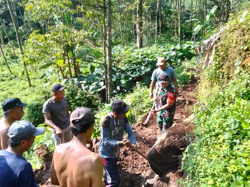 Semangat gotong royong ditunjukkan anggota Koramil 0820-09/Lumbang bersama masyarakat Desa Negororejo dengan melaksanakan kerja bakti membangun jembatan darurat dan membuka jalan alternatif pasca bencana tanah longsor di Dusun Genting, Desa Negororejo, Kecamatan Lumbang, Kabupaten Probolinggo, Selasa (31/3/2026).