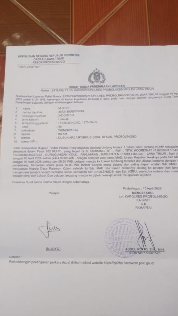 Setelah mendapatkan penanganan medis sekaligus visum, akhirnya korban meneruskan kejadian ini dengan langkah pelaporan kepihak Polres Probolinggo dengan bukti laporan Nomor STTLP/B/77/IV/2026/SPKT/POLRES PROBOLINGGO/POLDA JAWA TIMUR. Yang jelas pelaporan tersebut berisi tindak pidana pengeroyokan Undang undang No.1 tahun 2023 tentang KUHP sebagaimana dimaksud dalam pasal 262 KUHP.